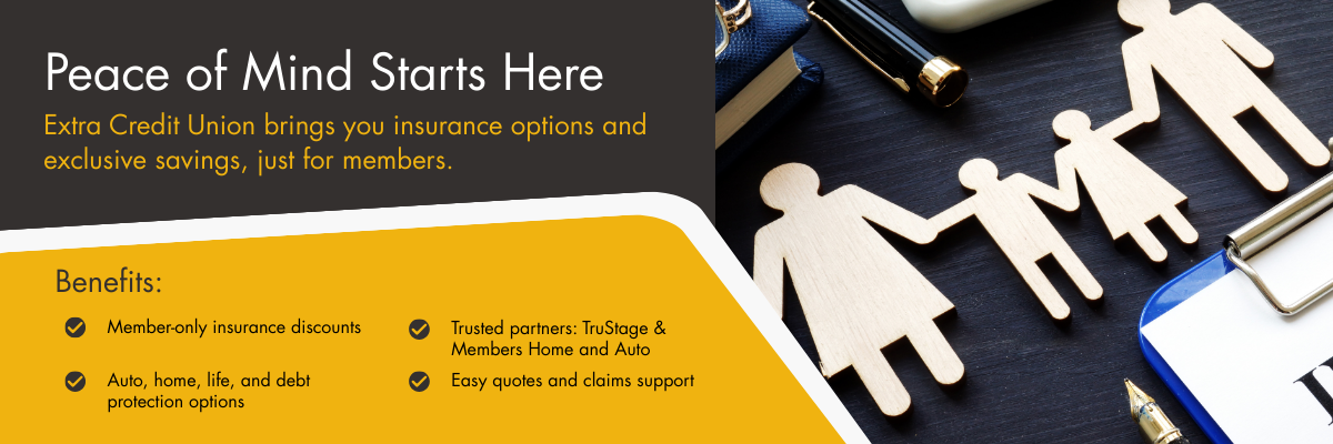 To help you protect yourself, Extra Credit Union offers an opportunity to purchase insurance coverage at great rates through our trusted partners, TruStage and Members Home and Auto. Mention that you are a credit union member to get a special discount!